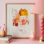 Large scale florals, thick, textured brush strokes, dripping paint on a subdued pastel or contrasting dark, moody background is her signature style.