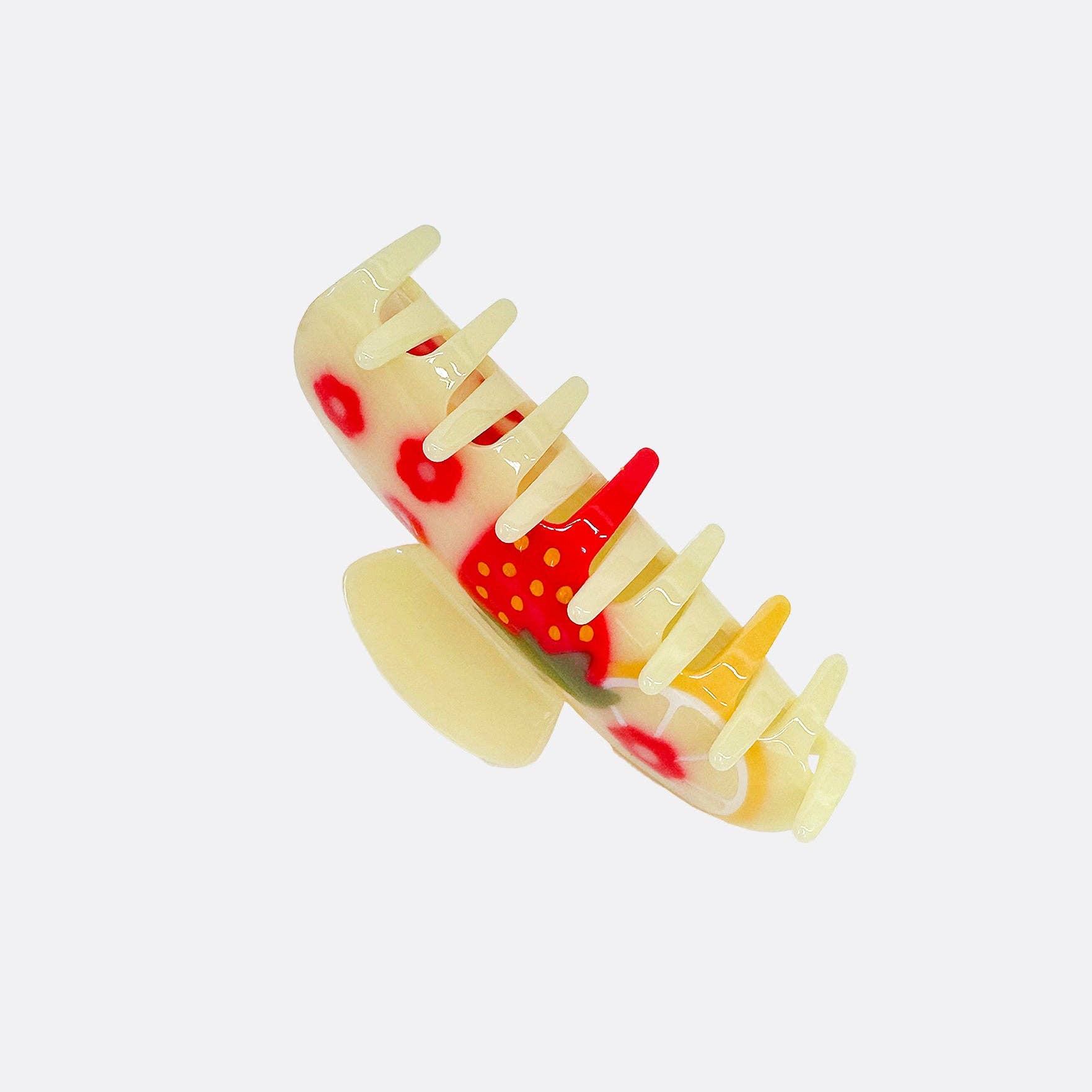 Add a splash of sunny charm to your hairstyle with the Lemonade Hair Claw. This buttery yellow claw, crafted from mixed acetate, blends durability and style effortlessly. Measuring 4 inches wide, it’s perfect for securing locks with a pop of playful color. Adorned with a quirky yellow strawberry engraving, it turns a simple hair accessory into a fun statement piece. Whether you're rocking a casual updo or taming a wild mane, this claw brings a cheerful vibe and reliable hold all day long. Brighten your look and your mood in one easy snap!