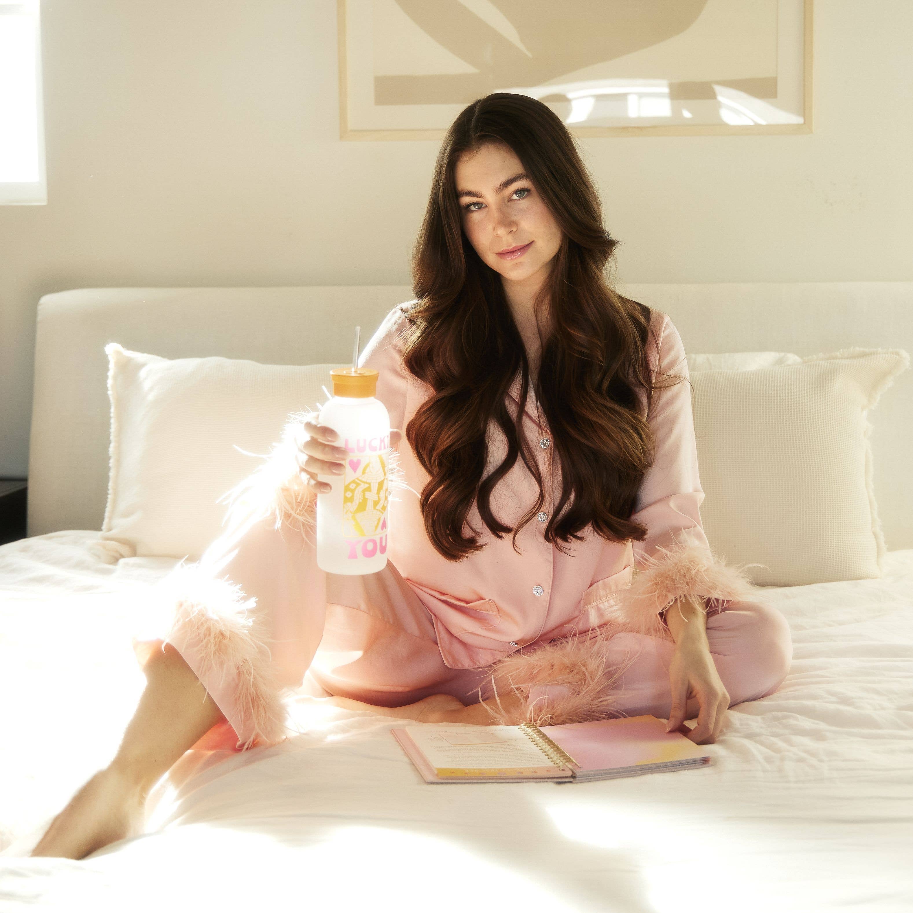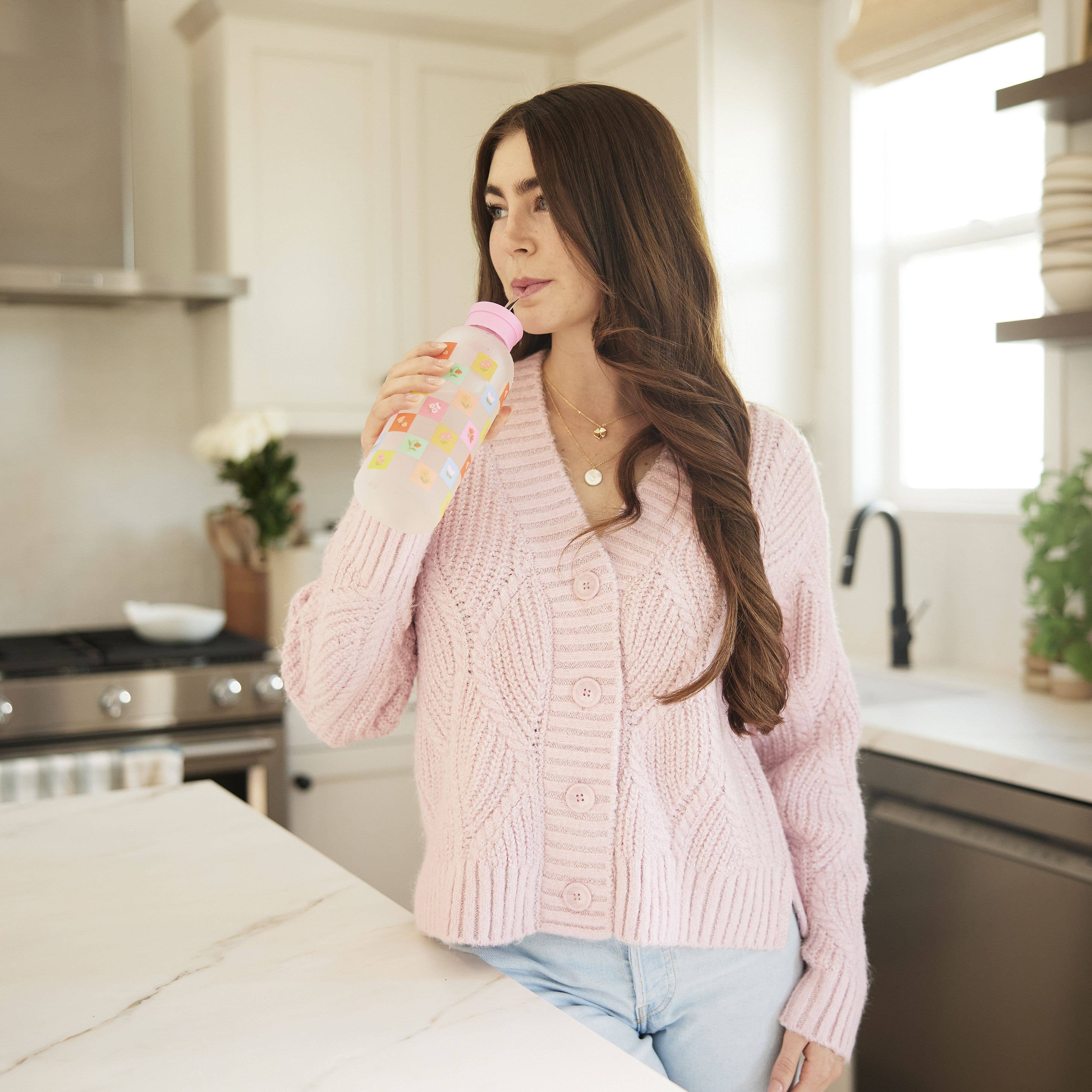 Studio Oh!’s glass water bottle with a straw is your fun companion for staying hydrated all day long! This eco-friendly bottle holds 25 ounces and is crafted from tough, shatter-resistant borosilicate glass. Wrapped in a soft-touch silicone sleeve, it’s comfy to hold, slip-resistant, and spill-proof. Plus, every piece—from the bottle to the drip-free lid and plastic straw—is reusable, making it a playful and planet-friendly choice.